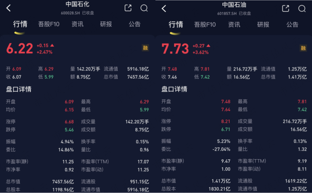 此外,中国石化市值7457亿(截至2023年6月27日,全部按A股价格计算总市值),而中国石油市值为1.41万亿,市值相差一倍。