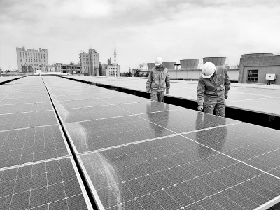 11月30日,光伏发电项目仪征化纤厂区屋顶部分建成并网发电,标志着中国石化装机容量最大的分布式光伏发电项目取得进展。该项目包括仪征化纤厂区屋顶及停车场光伏发电两部分,总装机容量25.8兆瓦,由新星公司与仪征化纤合作建设。项目全部投产后,预计每年可发绿电2600万千瓦时、节约标准煤8300吨。图为仪征化纤技术人员查看光伏组件的安装质量。