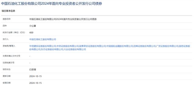 10月15日,中国石油化工股份有限公司2024年面向专业投资者公开发行公司债券获上交所受理。该债券拟发行金额400亿元,承销商/管理人包括中信建投、中信证券、国泰君安等。