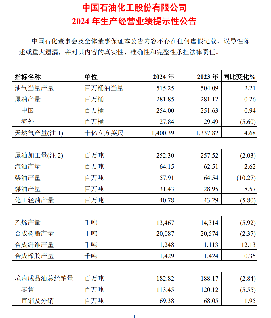 1月24日,中国石化发布2024年生产经营业绩,油气当量产量达到5.15亿桶油当量,同比增长2.21%;原油产量为2.82亿桶,同比增长0.26%。天然气产量达到1400.39十亿立方英尺,同比增长4.68%。