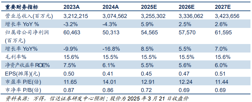 盈利预测与投资评级:我们预计公司2025-2027年归母净利润分别为545.65、575.70和615.95亿元,归母净利润增速分别为8.5%、5.5%和7.0%,EPS(摊薄)分别为0.45、0.47和0.51元/股,对应2025年3月21日的收盘价,对应2025-2027年PE分别为12.91、12.24和11.44倍。我们看好公司上游增储上产和下游板块景气改善,叠加公司高股东回报,我们维持公司“买入”评级。