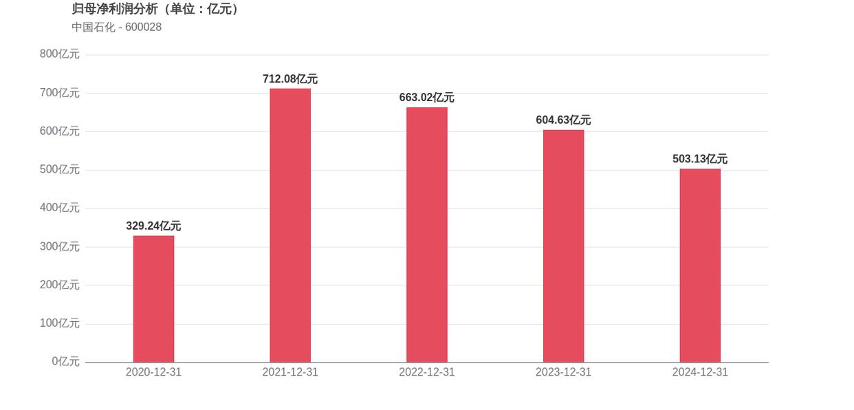 利润角度分析,2020年中国石化实现归母净利润329.24亿元,2024年503.13亿元。期间利润水平保持相对稳定并有所提升。