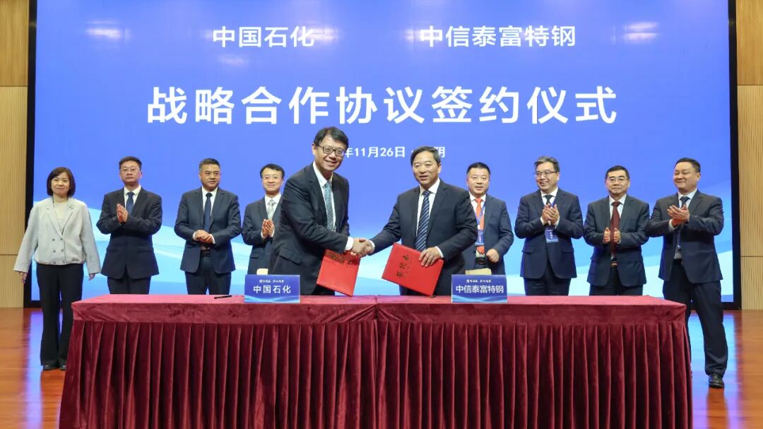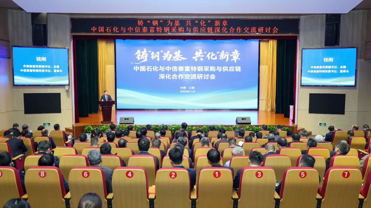 11月26日, 中国石化 股份公司与 中信泰富 特钢采购与供应链深化合作交流研讨会圆满举办。本次会议以“铸‘钢’为基,共‘化’新章”为主题,双方围绕产品应用、技术研发、供应链协同及重点项目等进行了深入交流与合作展望。 中国石化 物资装备部总经理、物资装备部(国际事业公司)党委书记孔 小强 ,物资装备部材料部总经理李晓华; 中信泰富 党委副书记、总裁, 中信泰富 特钢党委书记、董事长钱刚; 中信泰富 特钢党委副书记、总裁罗元东等领导出席会议。会议由 中信泰富 特钢销售总公司总经理蒋乔主持。