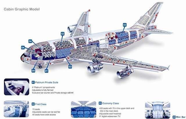空客A380是全球最大的双层宽体喷气客机,载客量比此前最大的客机多40%。机身长72.73米、宽79.15米,机身高24.07米,起飞全重高达560吨,飞行距离达到15000公里。南航A380采用典型的三舱是布局,拥有506个座位,上层客舱容纳70个可完全倾斜的商务舱座位和76个经济舱座位,下层则提供8个头等舱和352个经济舱座位。