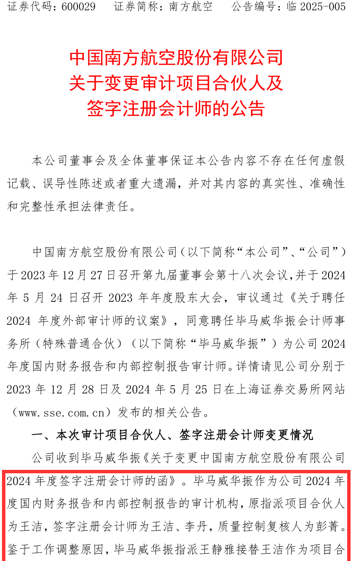 上交所上市公司南方航空(003816.SH)于2025年2月14日发布了《关于变更审计项目合伙人及签字注册会计师的公告》。公告显示,毕马威华振作为公司2024年度国内财务报告和内部控制报告的审计机构,原指派项目合伙人为王洁,签字注册会计师为王洁、李丹,质量控制复核人为彭菁。鉴于工作调整原因,毕马威华振指派王静雅接替王洁作为项目合伙人及签字注册会计师,继续完成公司2024年度国内财务报告和内部控制审计相关工作。变更后财务报告审计和内部控制审计项目合伙人为王静雅,签字注册会计师为王静雅、李丹,质量控制复核人为彭菁。