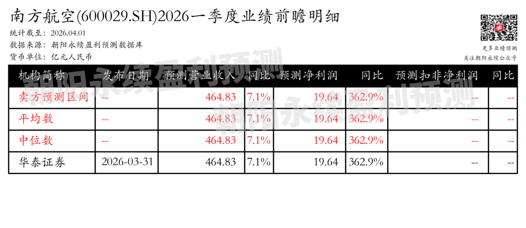 截至2026年04月01日,根据朝阳永续季度业绩前瞻数据: