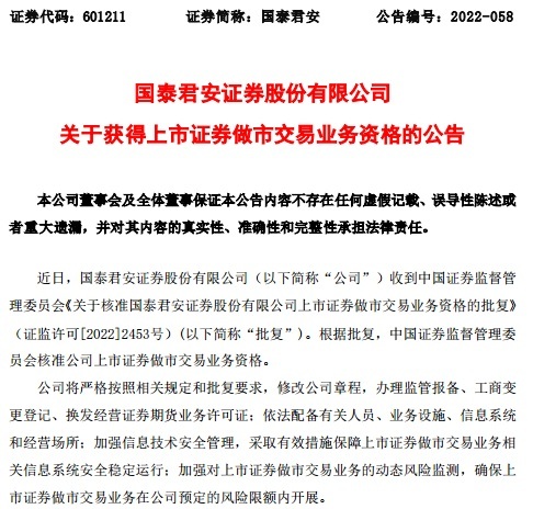 中信证券、国泰君安均在公告中表示,将严格按照相关规定和批复要求,修改公司章程,办理监管报备、工商变更登记、换发经营证券期货业务许可证;依法配备有关人员、业务设施、信息系统和经营场所;加强信息技术安全管理,采取有效措施保障上市证券做市交易业务相关信息系统安全稳定运行,确保该业务顺利开展。