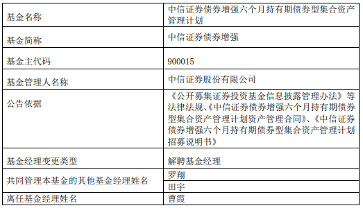 今日,中信证券股份有限公司发布公告,曹霞离任中信证券债券增强。