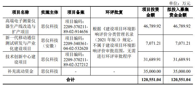 思仪科技原拟募集资金12.06亿元,用于高端电子测量仪器生产线改造与扩产项目、新一代移动通信测试研发与产业化建设项目、技术创新中心建设项目、补充流动资金。