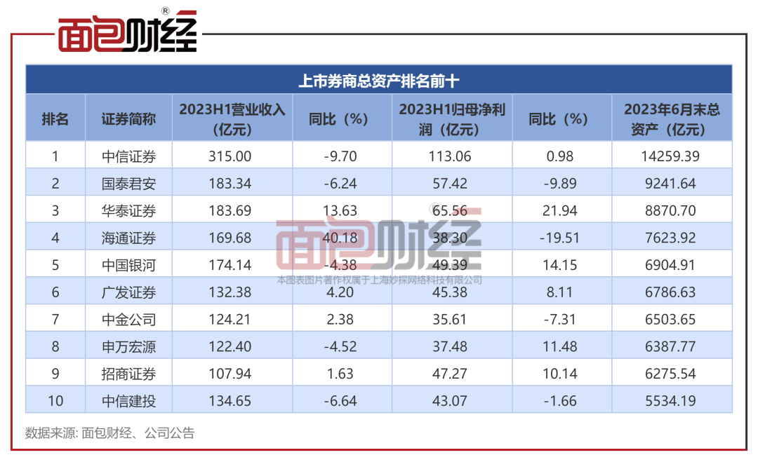 半年报显示,2023年上半年,中信证券资产规模达14259.39亿元,是业内首家资产突破万亿的券商。