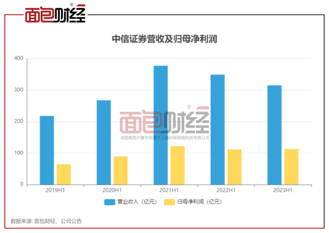 报告期内,中信证券实现营业收入315亿元,同比下降9.7%;归母净利润113.06亿元,同比微增0.98%。而在2022年上半年,中信证券营收就已出现下降,较2021年同期下降7.52%。