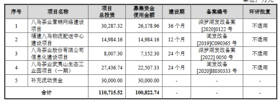 八马茶业原拟在深交所主板公开发行股票不超过2,580.00万股,原拟募集资金100,822.74万元,计划用于八马茶业营销网络建设项目、福建八马物流配送中心建设项目、八马茶业股份有限公司信息化建设项目、八马茶业武夷山生态工业园项目(一期)、补充流动资金。