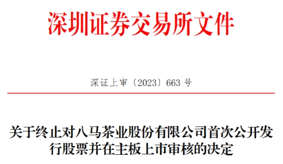深交所于2023年3月1日依法受理了八马茶业首次公开发行股票并在主板上市的申请文件,并依法依规进行了审核。2023年9月19日,八马茶业向深交所提交了《八马茶业股份有限公司关于撤回首次公开发行股票并在主板上市申请文件的申请》,保荐人向深交所提交了《中信证券股份有限公司关于撤回八马茶业股份有限公司首次公开发行股票并在主板上市申请文件的申请》。根据《深圳证券交易所股票发行上市审核规则》第六十二条的有关规定,深交所决定终止对八马茶业首次公开发行股票并在主板上市的审核。
