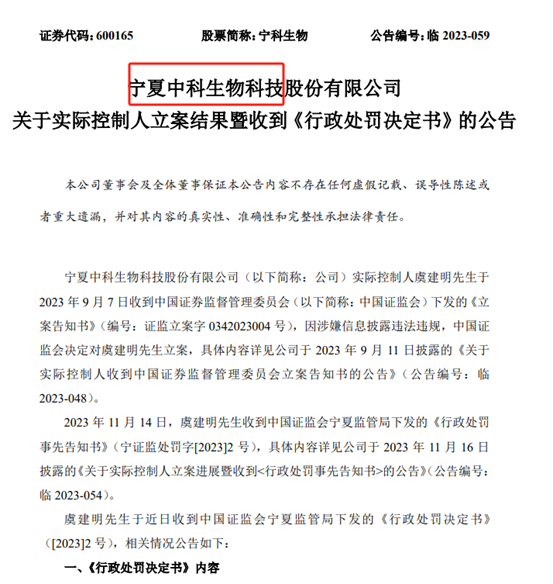 11月29日,宁科生物发布公告称,因实控人虞建明涉嫌犯罪被刑事强制措施的事实未及时书面告知公司,并配合公司履行信息披露义务,虞建明被宁夏证监局给予警告,并处以50万元罚款。