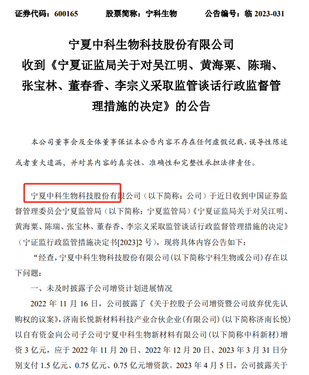 2023年6月,因未及时披露子公司增资计划进展情况、未披露重大诉讼事项、未及时披露业绩预告更正公告,宁科生物被出具警示函,董事长吴江明、总经理陈瑞、董秘张宝林、财务总监董春香、时任董事长黄海粟、时任独立董事兼审计委员会召集人李宗义等被采取监管谈话。