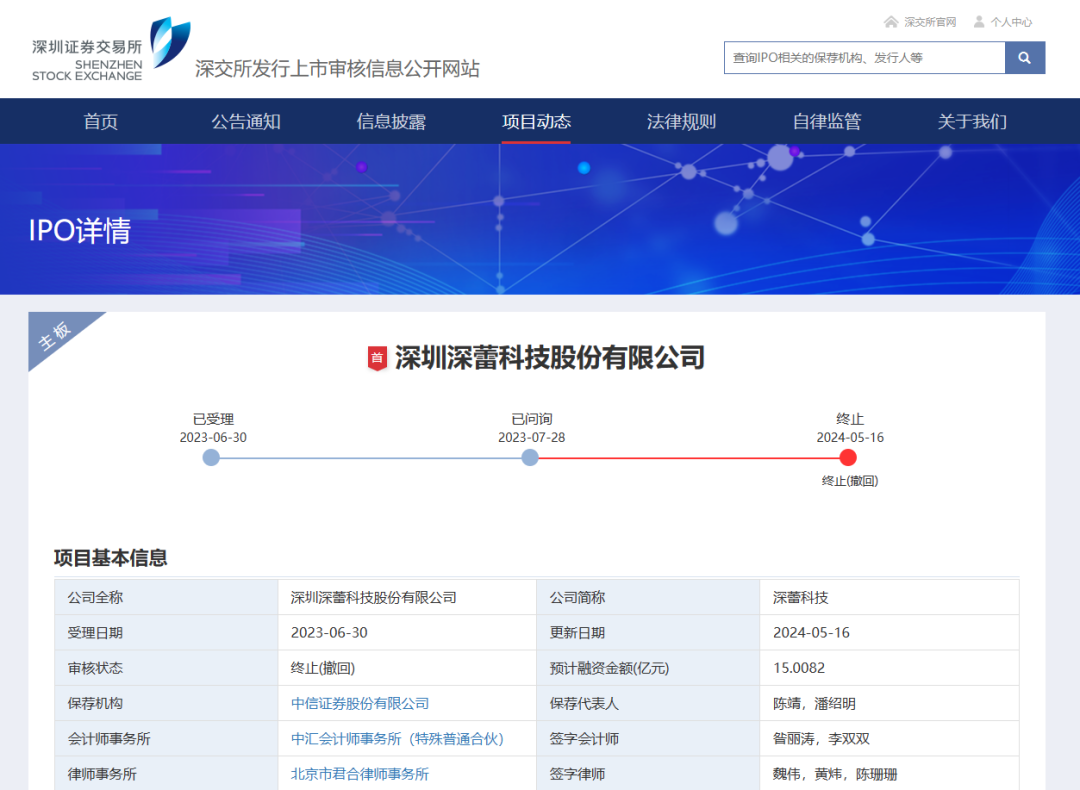 2024-05-16因深圳深蕾科技股份有限公司、保荐人撤回发行上市申请,根据《深圳证券交易所股票发行上市审核规则(2024年修订)》第六十二条,本所决定终止其发行上市审核。