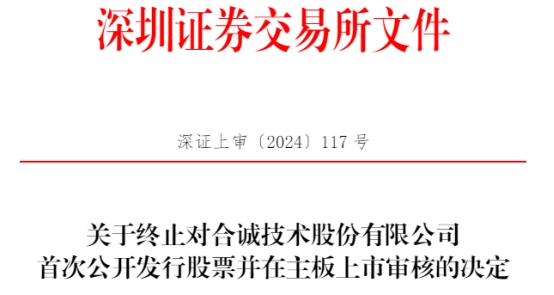 深交所网站于5月24日披露了关于终止对合诚技术股份有限公司(以下简称“合诚技术”)首次公开发行股票并在主板上市审核的决定。