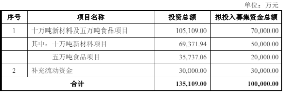 合诚技术原拟在深交所主板公开发行股票不低于4,000.00万股,且不高于12,000.00万股。公司原拟募集资金100,000.00万元,分别用于十万吨新材料及五万吨食品项目、补充流动资金。