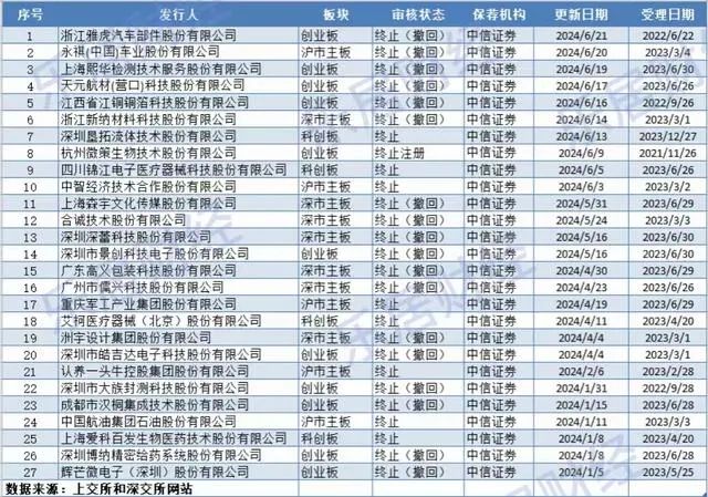 图片来自于《乐居财经》,6月21日之前,中信证券已经有27家机构撤回IPO申请!