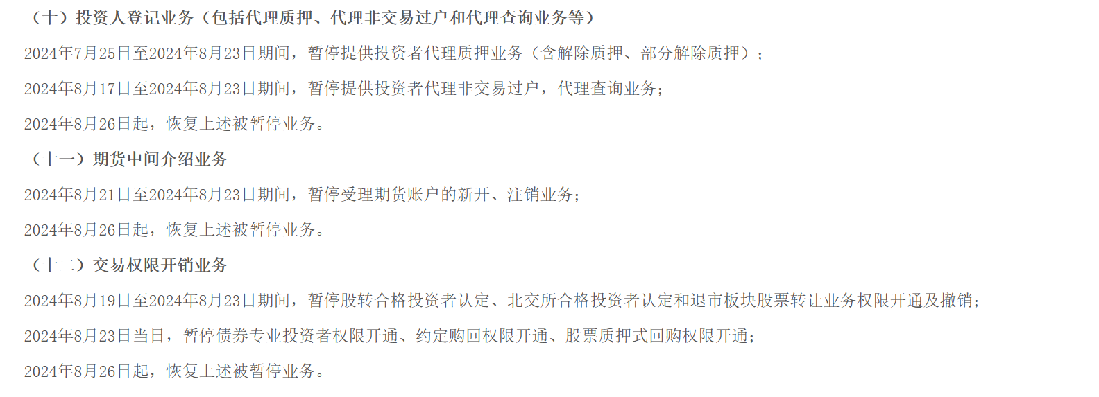 另外,为了避免发生可能影响整体迁移顺利开展的情形,中信证券相关分支机构在规定时间范围内暂不办理客户通过手机APP、网上交易客户端、iPad见证终端、分支机构柜台现场等所有渠道发起的以下账户类业务、适当性交易权限业务。以下是有关内容的公告截图: