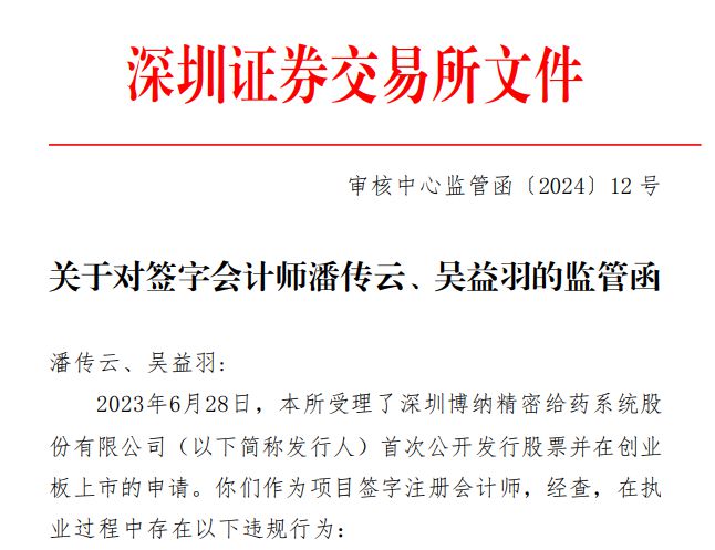 红星资本局8月11日消息,8月9日,深交所披露了《关于对保荐代表人谢博维、张强的监管函》以及《关于对签字会计师潘传云、吴益羽的监管函》,所涉及的是IPO项目深圳博纳精密给药系统股份有限公司(下称“博纳精密”)。