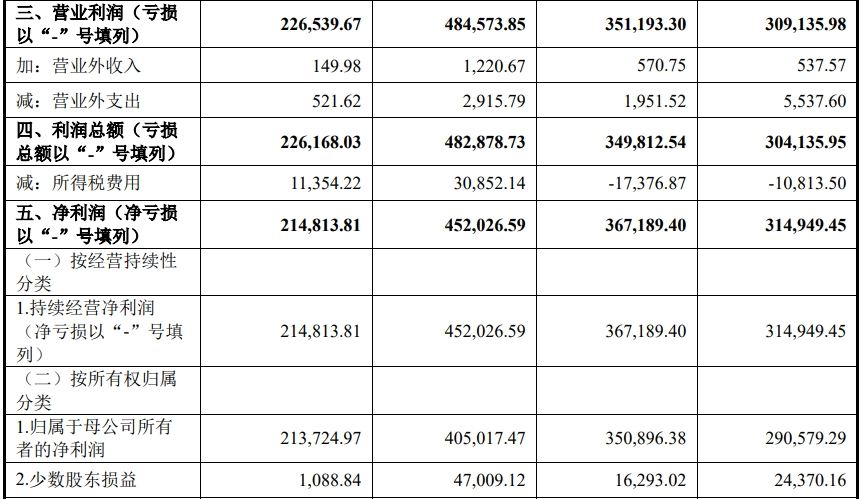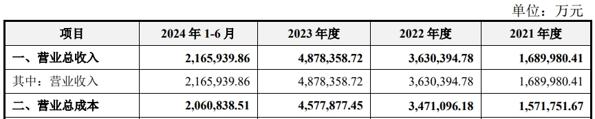 2021年至2024年1-6月,公司营业收入分别为169亿元、363.04亿元、487.84亿元和216.59亿元,整体呈现增长趋势;公司归属于母公司股东的净利润分别为29.06亿元、35.09亿元、40.50亿元和21.37亿元。