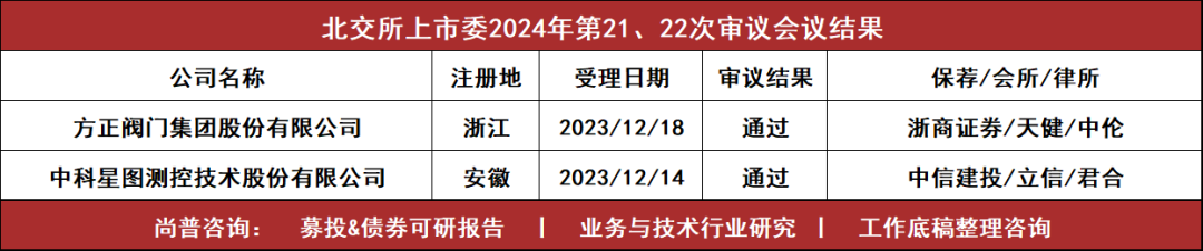 北交所上市委举行了2024年第21次、第22次审议会议(参会委员:杨艺新、张胜、施凤林、马战伟、时晋;李杜、张雯雯、冯丽霞、江洋子、张华),共审议2家企业,方正阀门、星图测控北交所IPO均获通过。