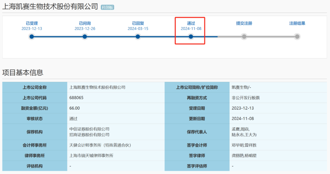 凯赛生物11月8日晚间发布公告称,公司收到上交所出具的《关于上海凯赛生物技术股份有限公司向特定对象发行股票审核意见的通知》。公司向特定对象发行股票申请符合发行条件、上市条件和信息披露要求。