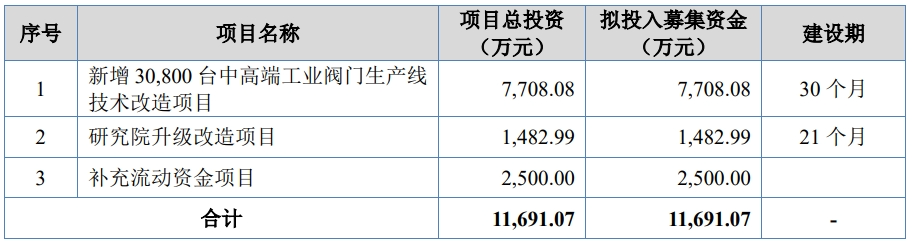 公司本次IPO预计募集资金1.17亿元,分别用于新增30,800台中高端工业阀门生产线技术改造项目、研究院升级改造项目、补充流动资金。