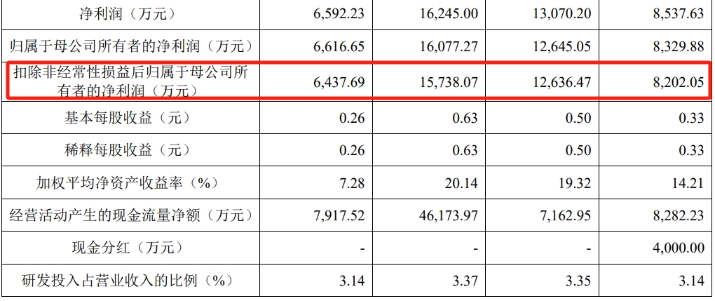 2021年至2024年1-6月,公司实现营业收入分别为1.04亿元、1.41亿元、2.29亿元和8,135.97万元,实现扣非后净利润分别为3,485万元、3,032.29万元、5,080.24万元和1,244.20万元。