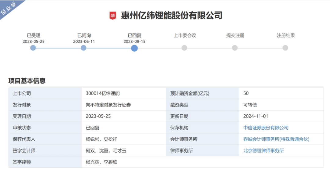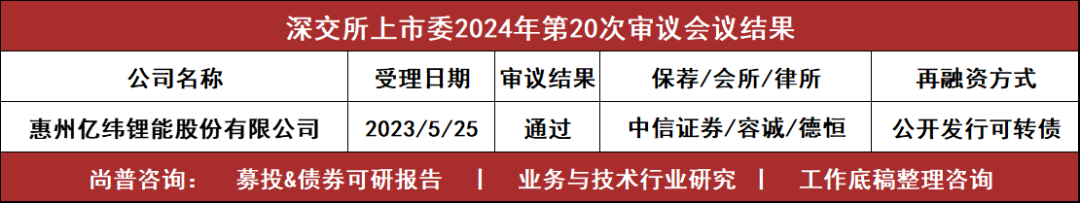 深交所上市审核委员会召开2024年第20次审议会议(参会委员:卢博、刘地亮、吴年文、陈坦坦、胡丹),共审议1家企业,亿纬锂能公开发行可转债申请获通过。