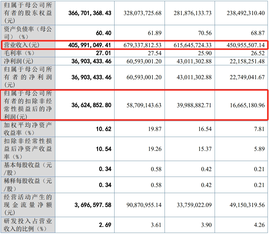 2021年至2024年1-6月,公司实现营业收入分别为10.11亿元、14.78亿元、15.44亿元和7.38亿元,实现扣非后净利润分别为8,202.05万元、1.26亿元、1.57亿元和6,437.69万元。