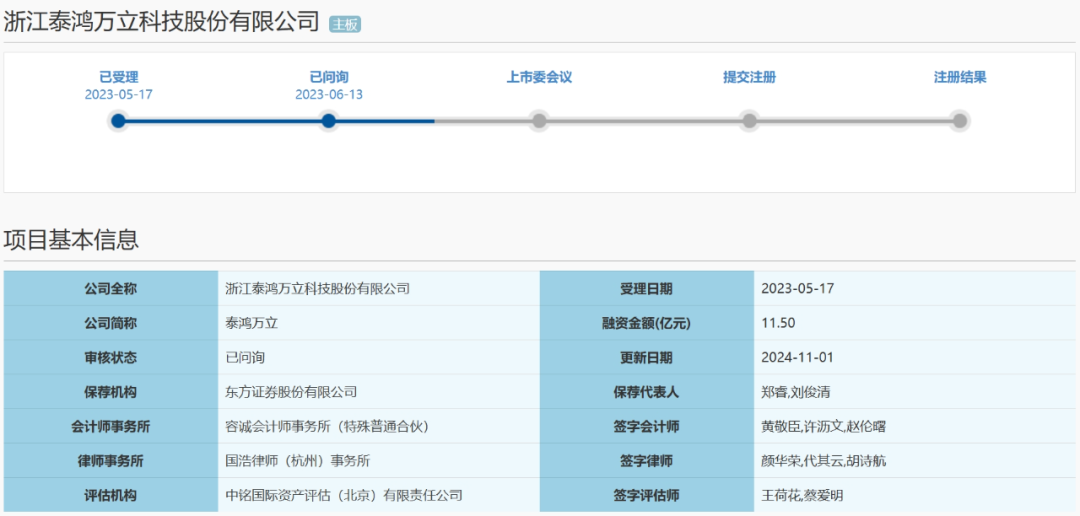 11月8日,上交所举行了2024年第28次审议会议(参会委员:许付生、金俊超、郭新成、楚晋宏、潘妙丽),共审议1家企业,泰鸿万立沪市主板IPO获通过。