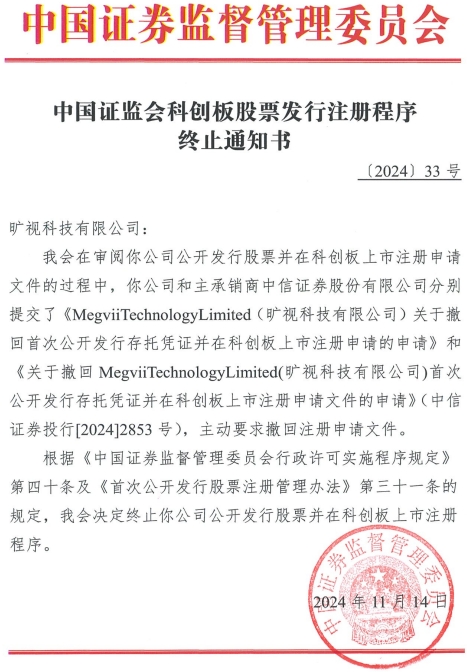 中国证券监督管理委员会近日向旷视科技有限公司(以下简称“旷视科技”)下发《中国证监会科创板股票发行注册程序终止通知书》(〔2024〕33号)。