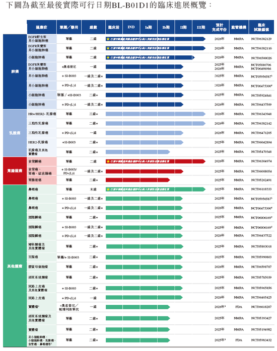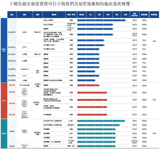 全球领先的创新ADC药物研发平台,成功研发包括BL-B01D1在内的已进入临床阶段的8个ADC创新药物管线,并已开展了约50项临床研究,其中8个后线III期临床及12个一线II期临床。