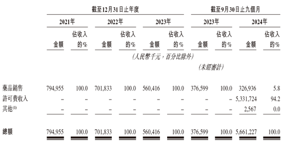 *于2024年前九个月,百利天恒亦通过许可费收入产生收入,为根据BMS协议首付款的一部分。根据BMS协议,于2024年3月,百利天恒从BMS收到不可退还及不可抵扣的首付款8亿美元(约人民币56.80亿元),公司就向BMS授出许可的履约确认收入7.51亿美元(约人民币53.32亿元)。余下首付款4900万美元分配至转让制造技术的履约义务,计入合同负债,转让时间由BMS酌情决定。