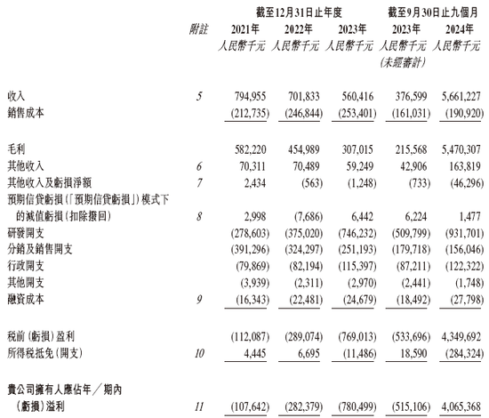 招股书显示,在过去的2021年、2022年、2023年和2024年前九个月,百利天恒的营业收入分别人民币7.95亿、7.02亿、5.60亿和56.61亿元,相应的研发开支分别为人民币2.79亿、3.75亿、7.46亿和9.32亿元,相应的净利润分别为人民币-1.08亿、-2.82亿、-7.80亿和40.65亿元。