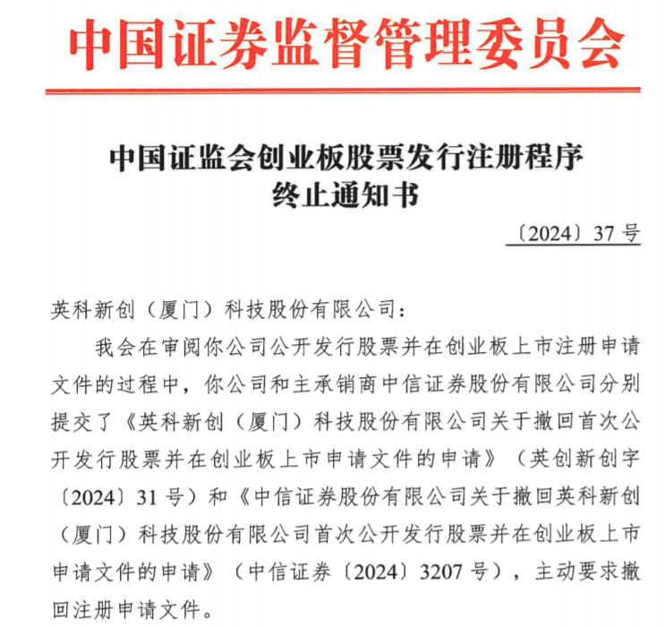 同时,在时隔一个月之后,中信证券为主承销商的英科新创主动要求撤回注册申请文件。