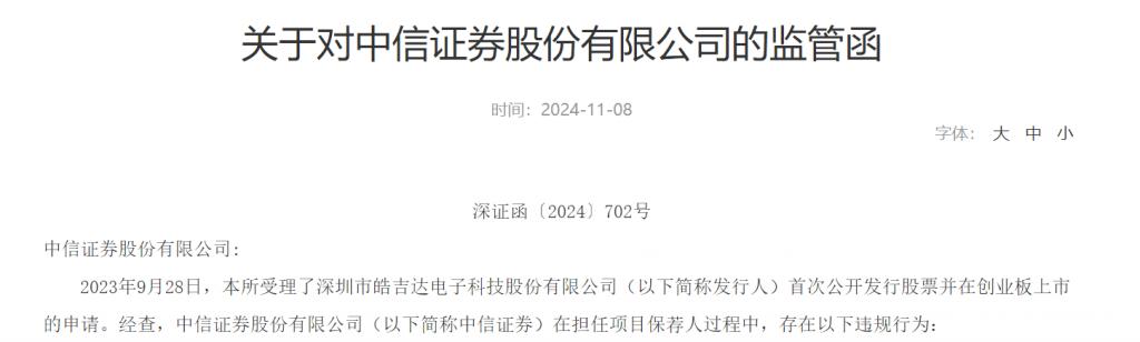 2024 年 11 月,中信证券作为皓吉达创业板 IPO 项目的保荐人,因在项目过程中存在违规行为而收到深交所监管函。