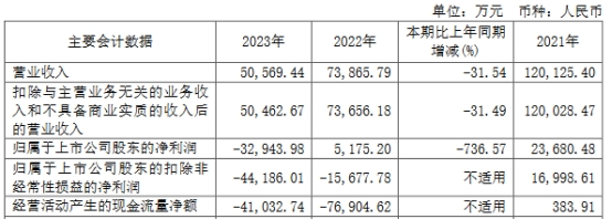 公司2023年实现营业收入5.06亿元,同比减少31.54%;归属于上市公司股东的净利润-3.29亿元,上年同期为5175.20万元,同比盈转亏,下降736.57%;归属于上市公司股东的扣非净利润-4.42亿元,上年同期为-1.57亿元;经营活动产生的现金流量净额-4.10亿元,上年同期为-7.69亿元。