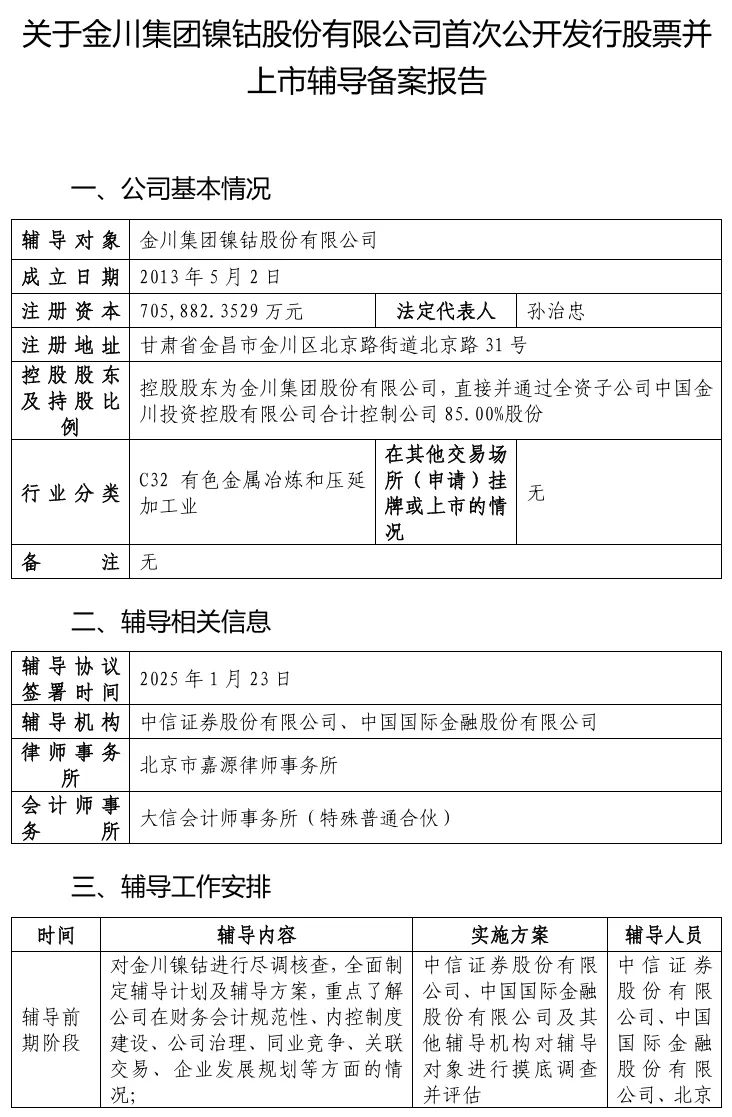 2025年1月23日,金川集团与中信证券签署辅导协议,宣告IPO启动!