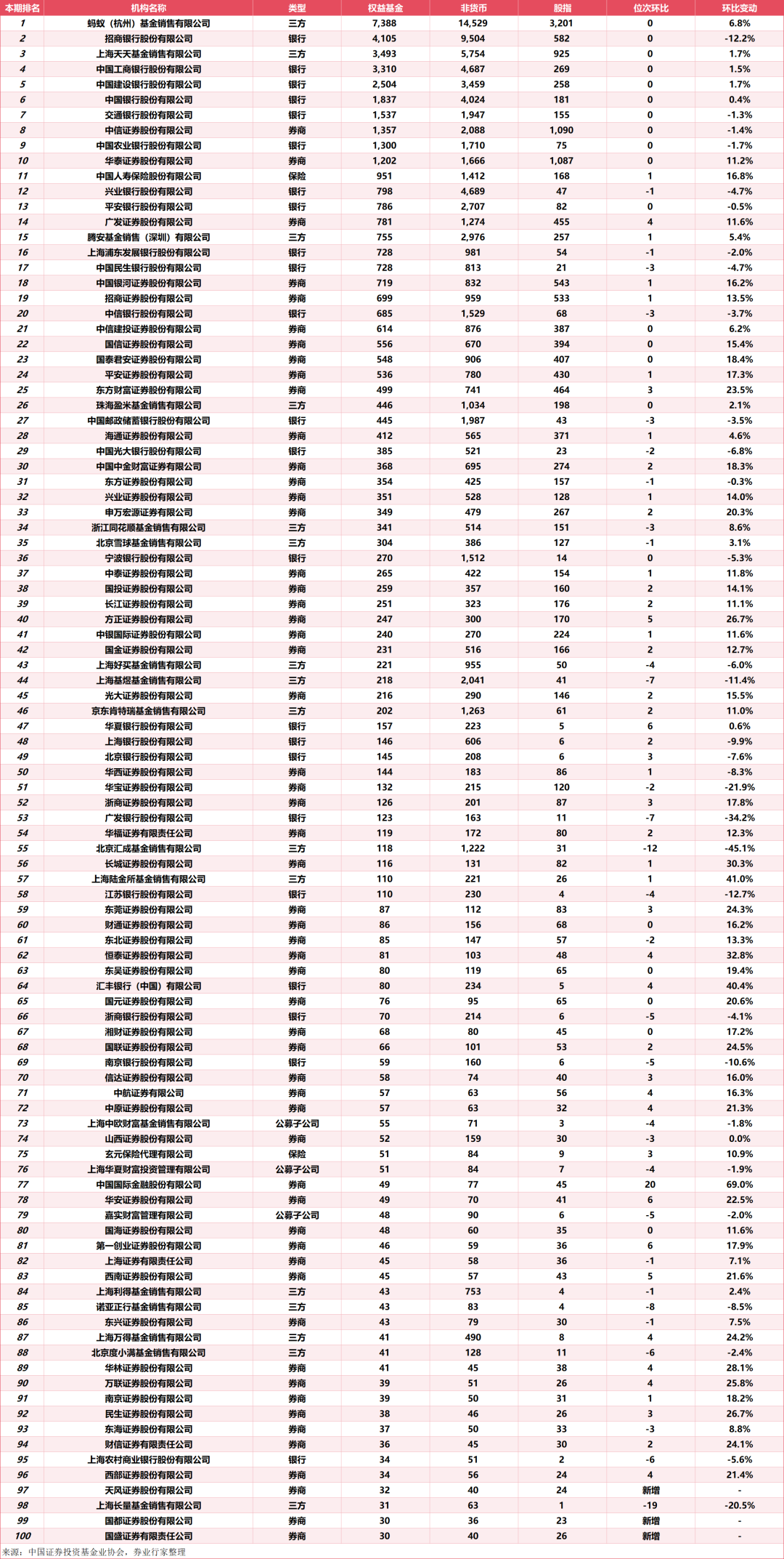 本期,56家券商,23家银行,16家三方机构,3家基金子公司和2家保险机构,位列百强榜。与2024年上半年相比,青岛银行和杭州银行两家银行机构,以及“卖身”华源证券的北京中植基金销售有限公司(简称:中植基金)退出榜单;天风证券、国都证券和国盛证券,三家券商“组团”入榜。