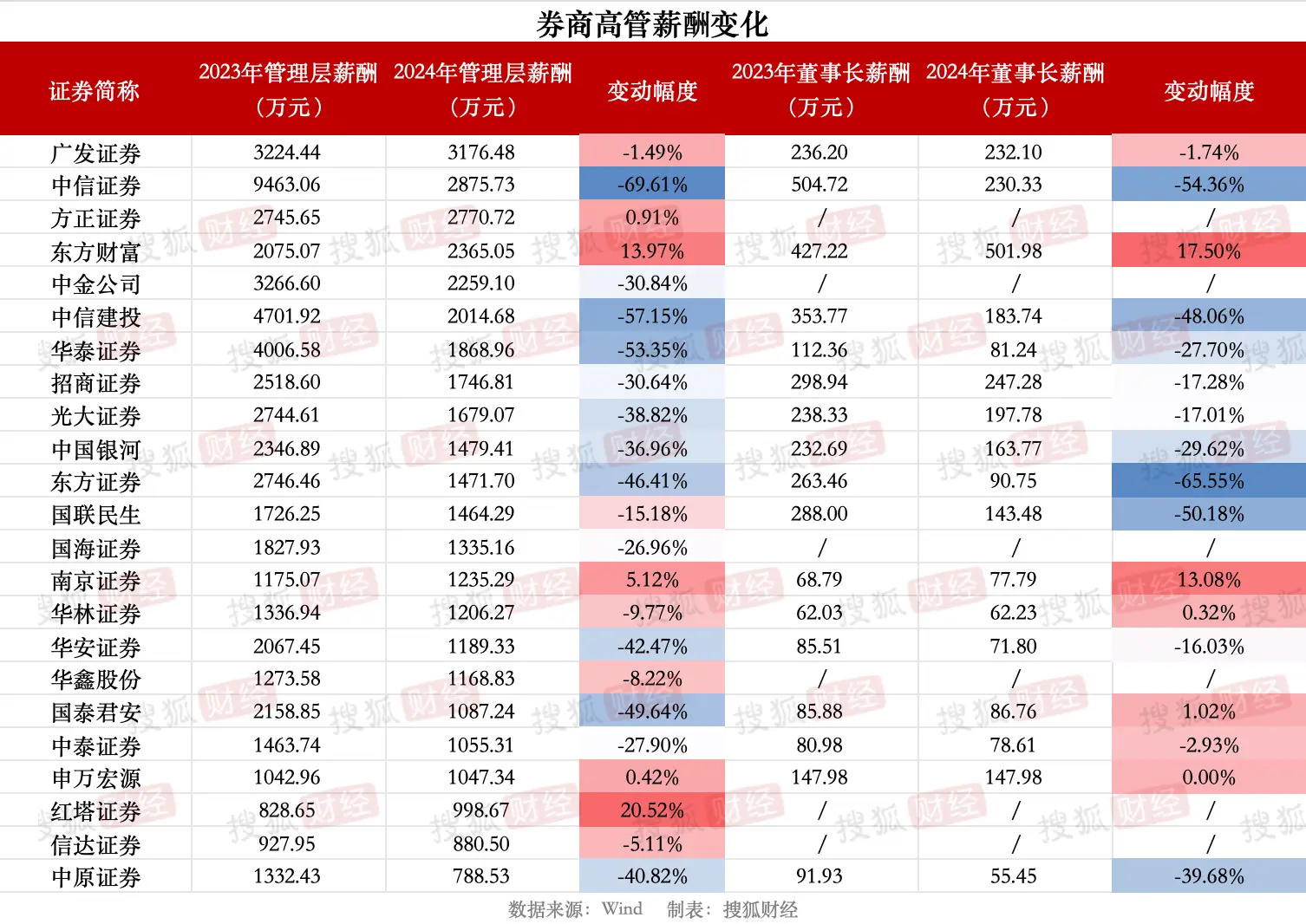 除了互联网券商东方财富,其余券商董事长薪酬已全部降至300万元以下,其中中信证券、东方证券、国联民生证券董事长薪酬降幅超过50%。