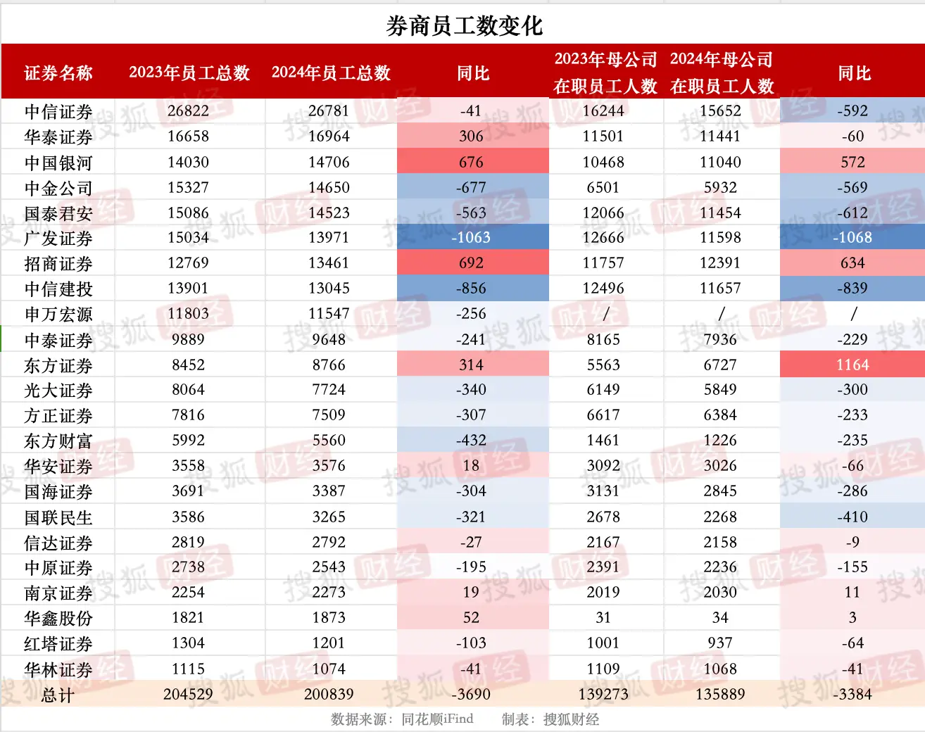 数据显示,2023年至2024年,已披露年报的23家券商员工从约20.45万人降至20.08万人,同比减少3690人;母公司员工总数从13.93万人降至13.59万人,减少3384人。
