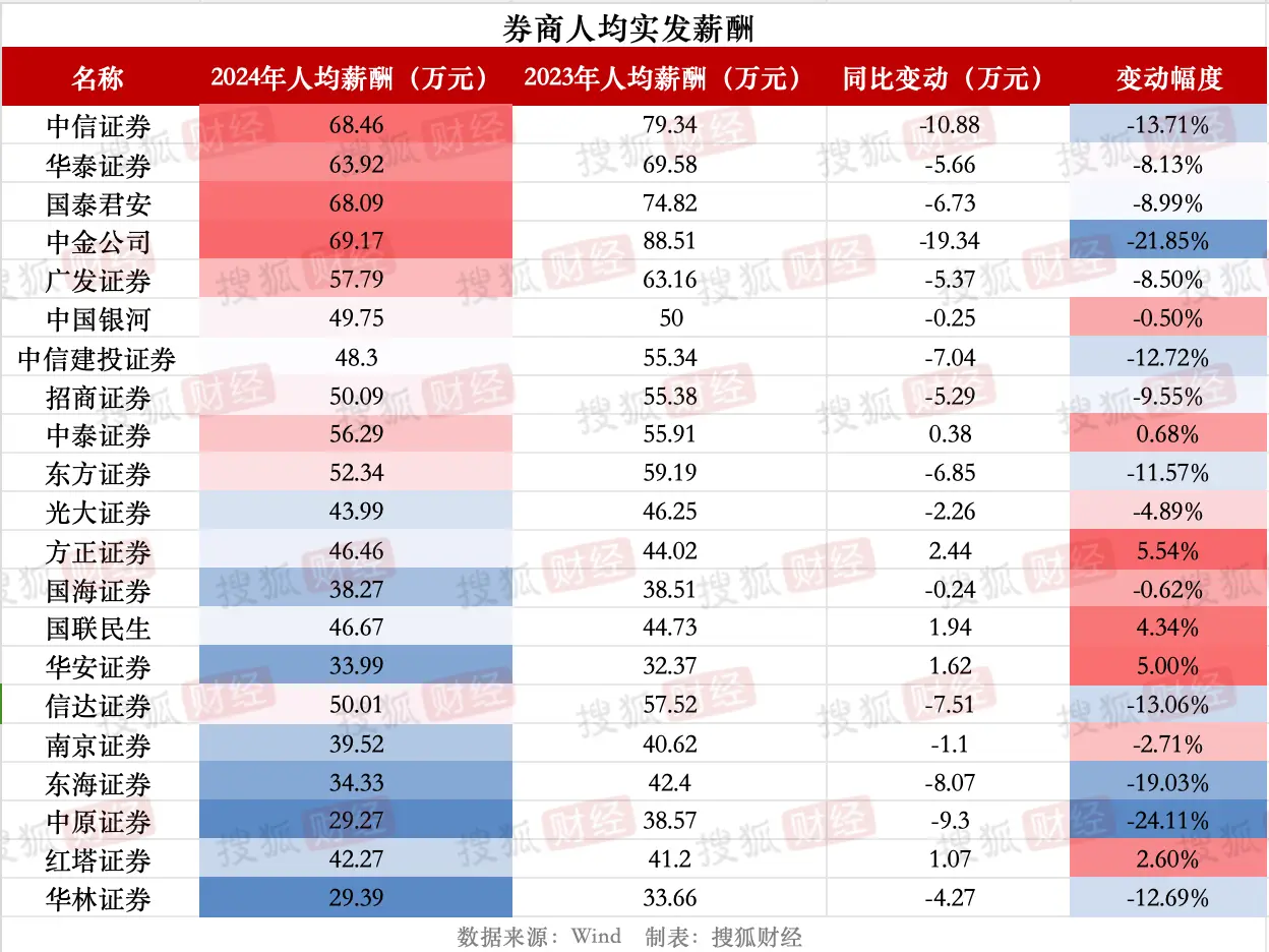 中信证券、国泰君安、华泰证券去年人均年薪分别为68.46万元、68.09万元、63.92万元,同比均有不同程度地下滑。