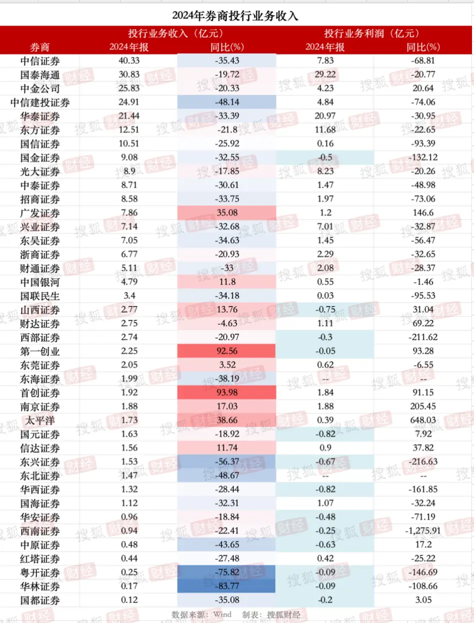 头部券商投行业务普遍收缩三成左右,中信证券投行收入40.33亿元,同比降35%;华泰证券收入21.44亿元降33%,中信建投降48%至24.91亿元。