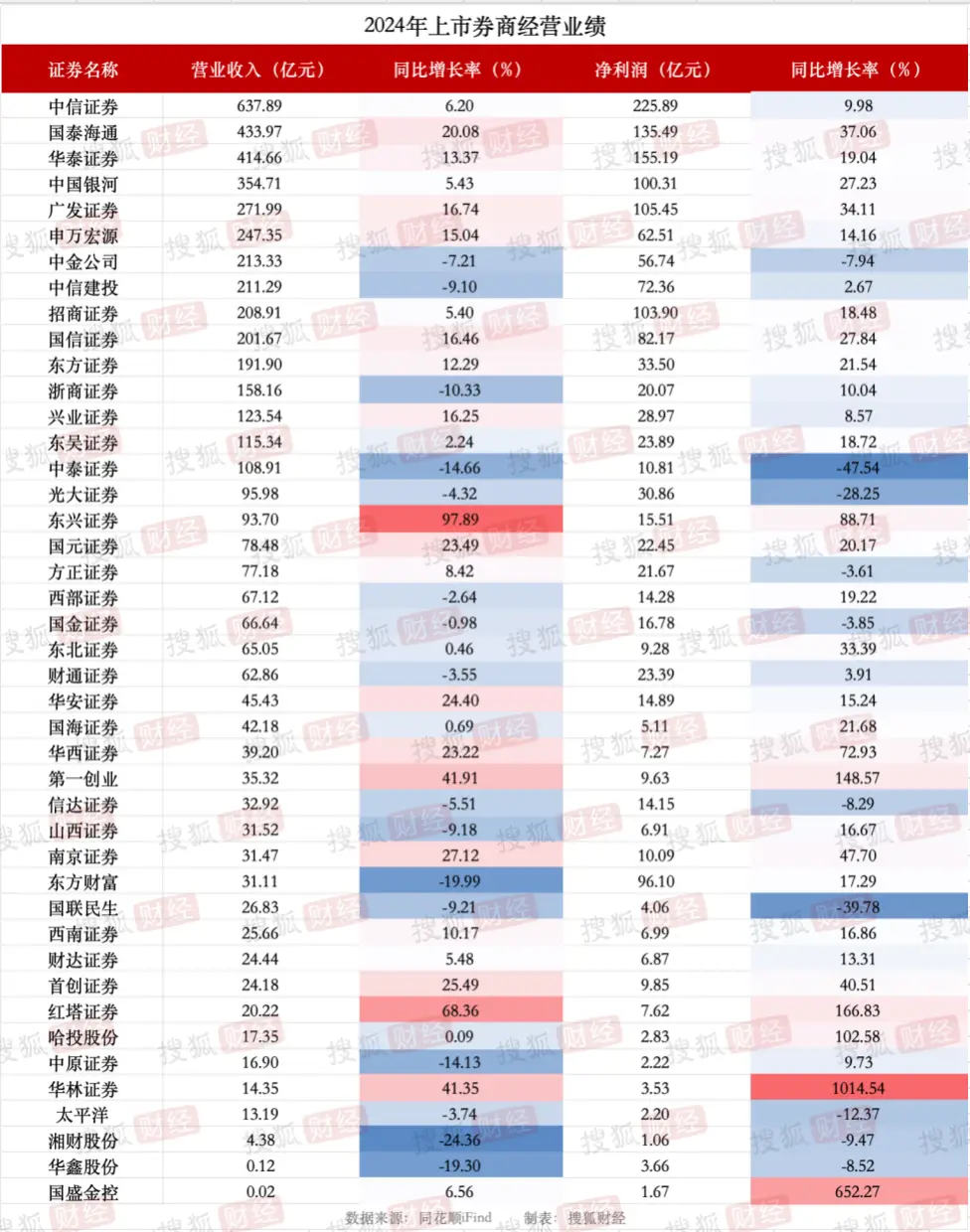 净利润方面,33家券商盈利实现正增长,10家出现下滑。华林证券以1014.54%的净利润增速在行业位居榜首,中泰证券(-47.54%)、国联民生(-39.78%)、光大证券(-28.25%)等则大幅收缩。