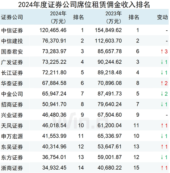 上市券商2024年报悉数披露完毕,年报中披露的交易单元席位租赁收入,直观综合反映券商服务各类机构客户交易的能力。统计数据显示,2024年度行业TOP 5中,中信证券以12.05亿元连续两年蝉联榜首;中信建投以7.64亿元继续位列第二名;国泰君安(不含海通证券)以7.33亿元跻身前三,比2023年提升三个位次;广发证券、长江证券分别以7.32亿元、7.22亿元位列第四名和第五名,但较去年排名均下降一位。
