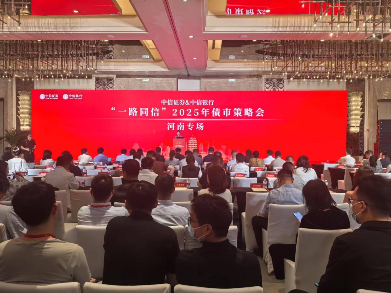 为深入探讨2025年债券市场发展趋势,助力河南企业更好地通过资本市场实现资产盘活,实现高质量发展,5月13日,中信证券、中信银行郑州分行联合举办“一路同信”2025年债市策略会。省内企业代表和投资人共计300余人出席会议。