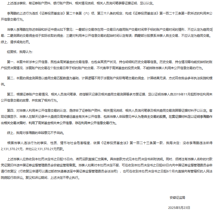 根据当事人违法行为的事实、性质、情节与社会危害程度,依据《证券投资基金法》第一百二十三条第一款,安徽证监局决定:没收李海鹏违法所得2,131,370.21元,并处以2,131,370.21元罚款。